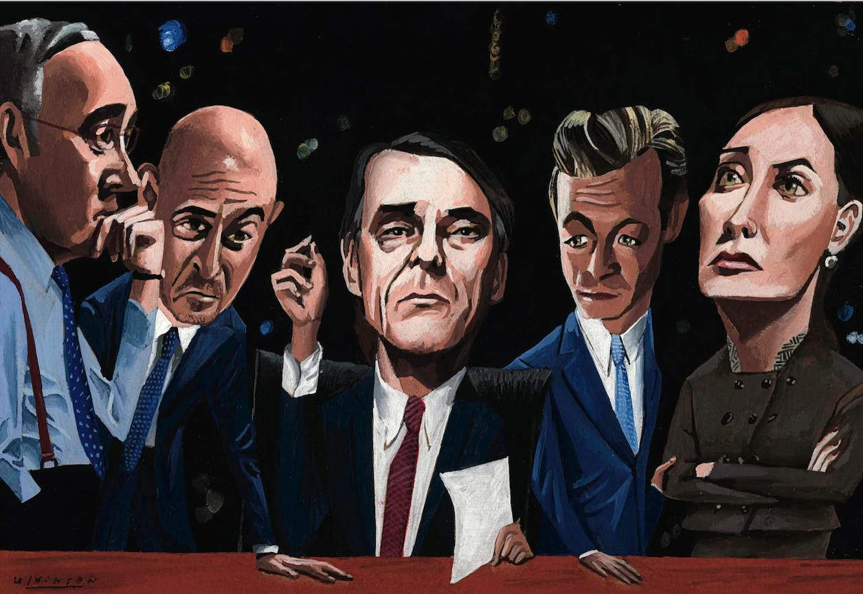 Eventually the crisis arrives at the board room where the CEO John Tuld (Jeremy Irons) commands the space. His speeches are theatrical and the board room gives him a chance to play off others and command authority over his ambitious, scheming subordinates. He’s the apotheosis of the establishment, a human manifestation of competitive ruthlessness.